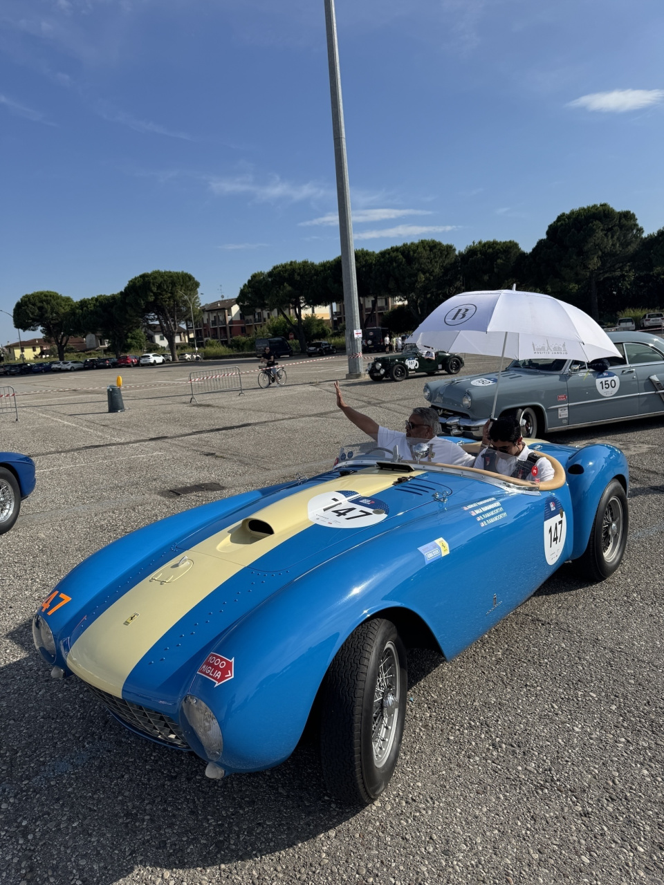 Was für ein Auftritt in blau-weiß: der Ferrari 375 Mille Miglia Spider Pini Farina von 1953.
