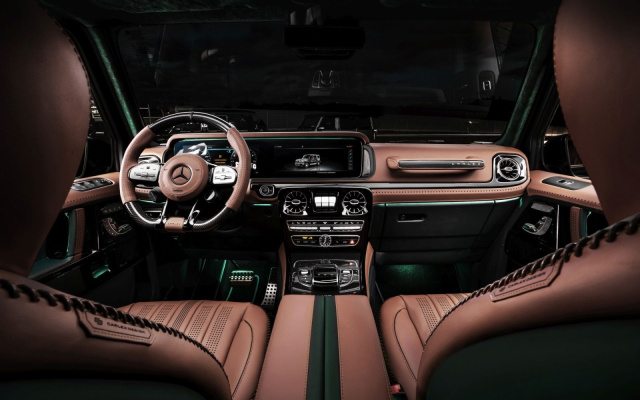 Das Exterieur wird durch den „Performmaster Carbon Fibre Body Kit“ eindrucksvoll ergänzt: Mit markanten Radkästen, aggressiv gestalteten Stoßfängern vorn und hinten sowie breiten Seitenschwellern bekommt die G-Klasse eine noch muskulösere Silhouette. Das Carbon-Dach und die passende Reserveradabdeckung setzen weitere exklusive Akzente.