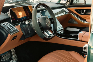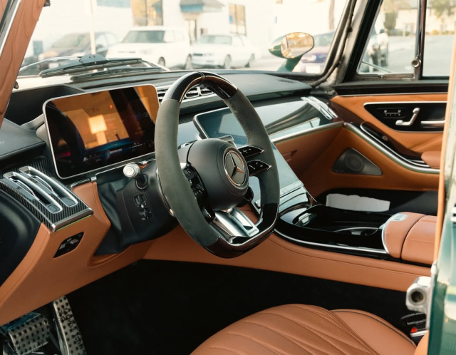 Im Innenraum findet sich die S-Klasse-Ausstattung inklusive AMG Performance Lenkrad, Nappaledersitze, OLED-Touchscreens, Sternenhimmel und Dolby Atmos Soundsystem wieder, wodurch klassische Formen und moderner Komfort perfekt verschmelzen.