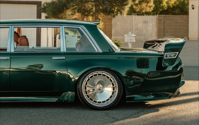 Optisch präsentiert sich der Final Boss mit einer maßgefertigten Pullman-Karosserie in Metallicgrün, verbreiterten Blechkotflügeln, XXL-Heckflügel, speziellen LED-Leuchten und überdimensionierten Chromfelgen, die den Mix aus Luxus und Motorsport unterstreichen.