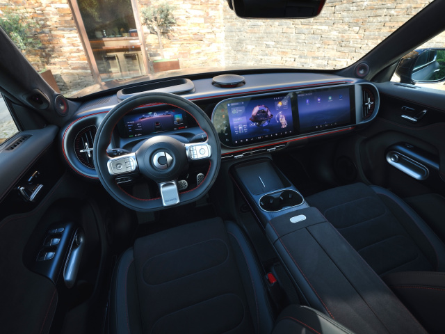 Diese 800-Volt-Plattform ist der Schlüssel zum Erreichen der spektakulären Ladeleistung von 400 kW, während das Basismodell mit 150 kW auskommen muss. Im Praxistest lud der Brabus in gerade einmal 16 Minuten von 10 auf 80 Prozent – schneller als die Werksangabe mit 18 Minuten. Die maximale Leistung, die während des Ladevorgangs erreicht wurde, betrug 407 kW, und bei 73 Prozent der Ladung lag die Leistung immer noch bei über 200 kW, was die meisten Konkurrenten nicht einmal bei Volllast erreichen. In zehn Minuten können weitere 318 Kilometer Reichweite eingetankt werden. So ist es zu verschmerzen, dass sich der Realverbrauch bei schneller Gangart auf bis zu 30 kWh / 100 km erhöht. Zudem ist der smart #5 Brabus mit ihren 21-Zöllern betont straff abgestimmt – auch härter als die bereits verfügbare China-Version. Dabei sind die Querbewegungen der Karosserie in schnellen Kurven sehr gut kontrollierbar. Wer im aggressivsten Brabus-Fahrmodus stark beschleunigt, wird mit brutaler Leistung in die Sportsitze gepresst. In den anderen Fahrmodi werden nur 51 (Eco), 65 (Comfort) oder 86 Prozent (Sport) der Leistung an beide Achsen verteilt.